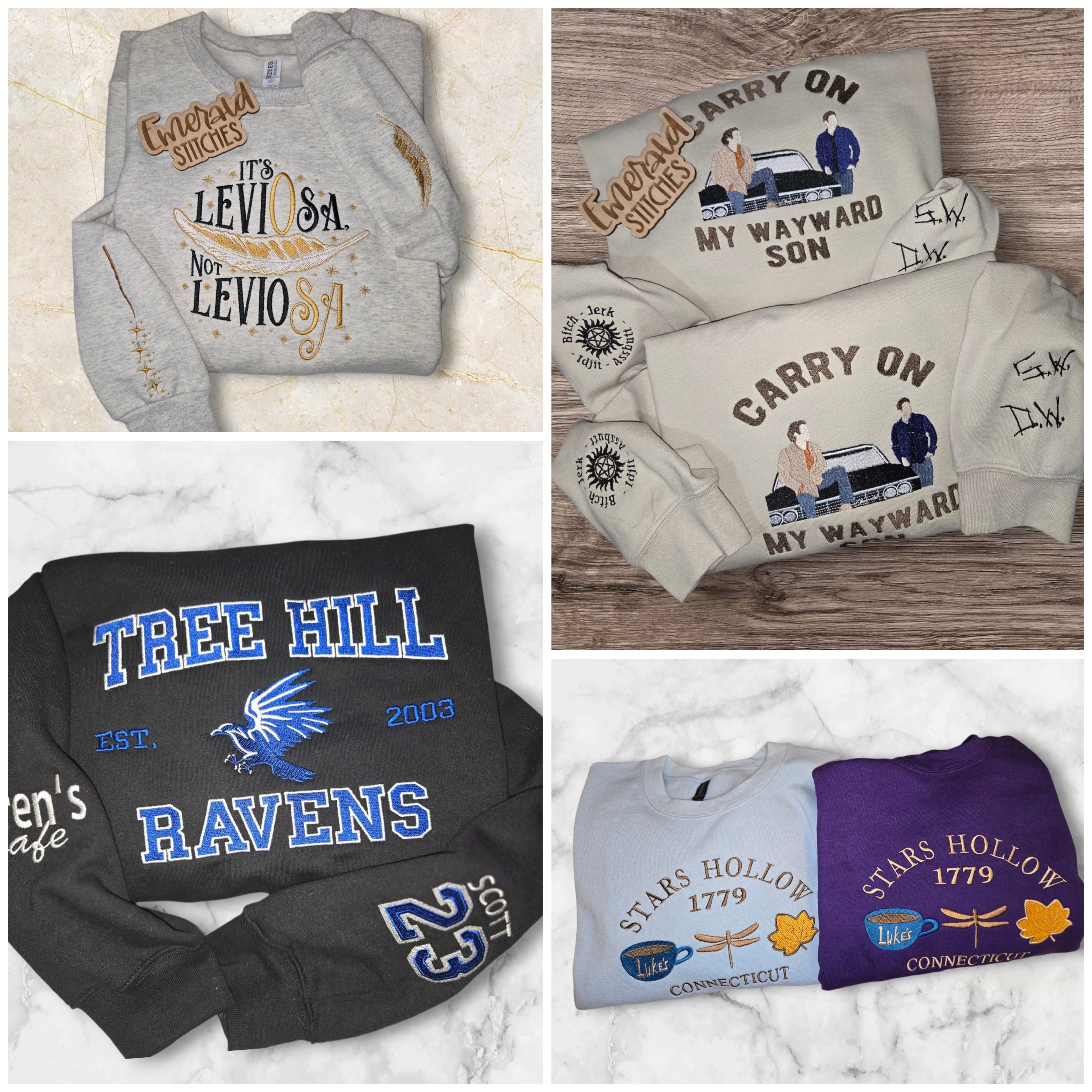 Do you have a Pinterest board Wishlist? Who doesn’t? Emerald stitches allows you to represent any tv show, book or movie imaginable for reasonable pricing! This type of custom embroidery is most popular. Contact me via email to customize your next favorite shirt.